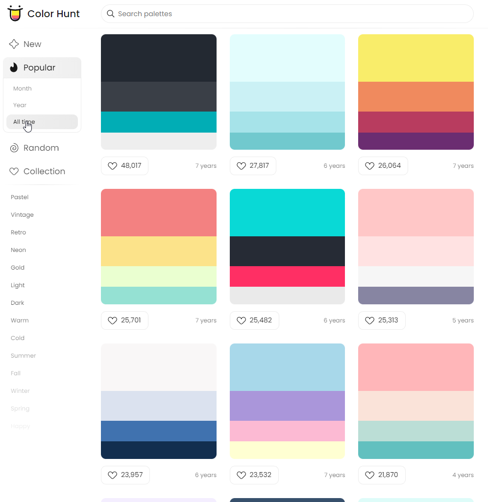 Discover the newest hand-picked color palettes of Color Hunt. Get color inspiration for your design and art projects.