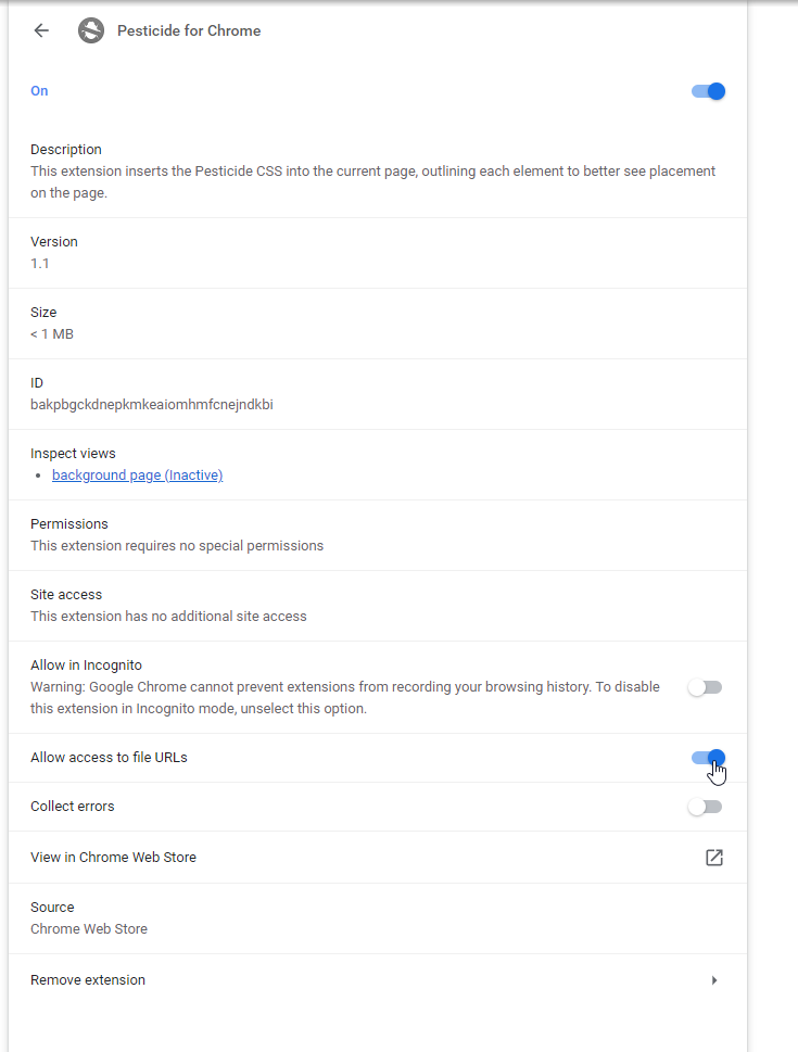 5. Presticide for Chrome의 Detail을 선택하여, Allow access to file URLs을 체크한다.