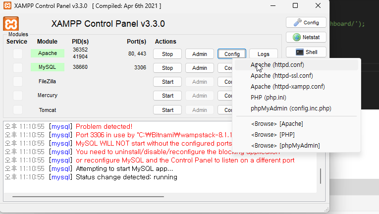 Apache의 Config 버튼을 클릭하면, httpd.conf 파일을 열어볼 수 있다.