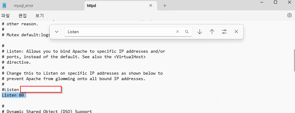 Listen을 검색해서, 몇번 포트로 세팅되어 있는지 확인한다. default는 80이다. 일단 그대로 사용함