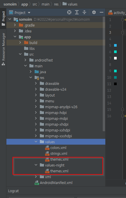 아래 화면처럼 res 파일 -> value 파일 -> theme.xml 파일을 수정해야 합니다.
