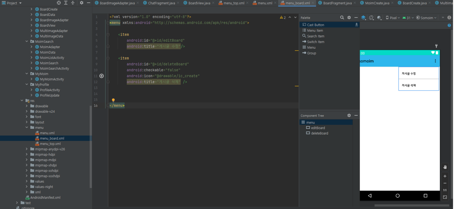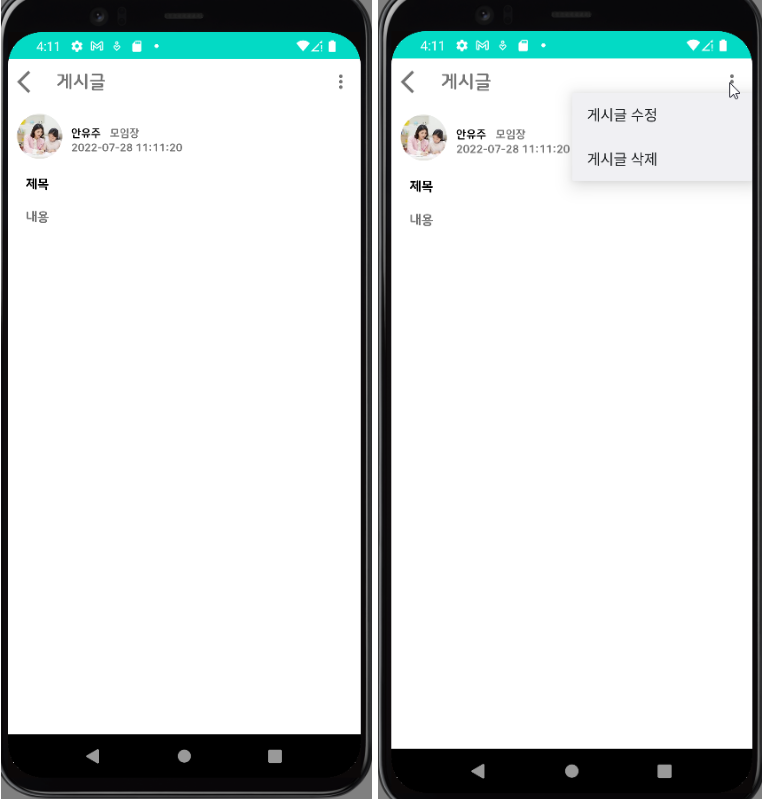 게시글 수정 또는 삭제를 선택할 수 있는 PopupMenu를 구현함.