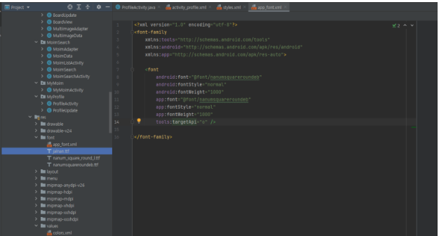 res 디렉토리에 font 디렉토리 생성 후, ttf 파일 저장. 그리고 app_font.xml 파일에 설정 필요