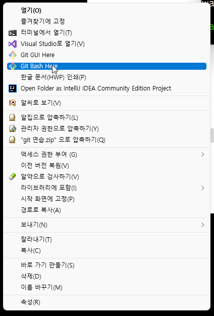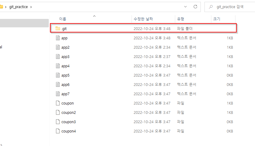 - .git 폴더가 생성됨 (git 파일이 저장되는 장소로 생각됨)