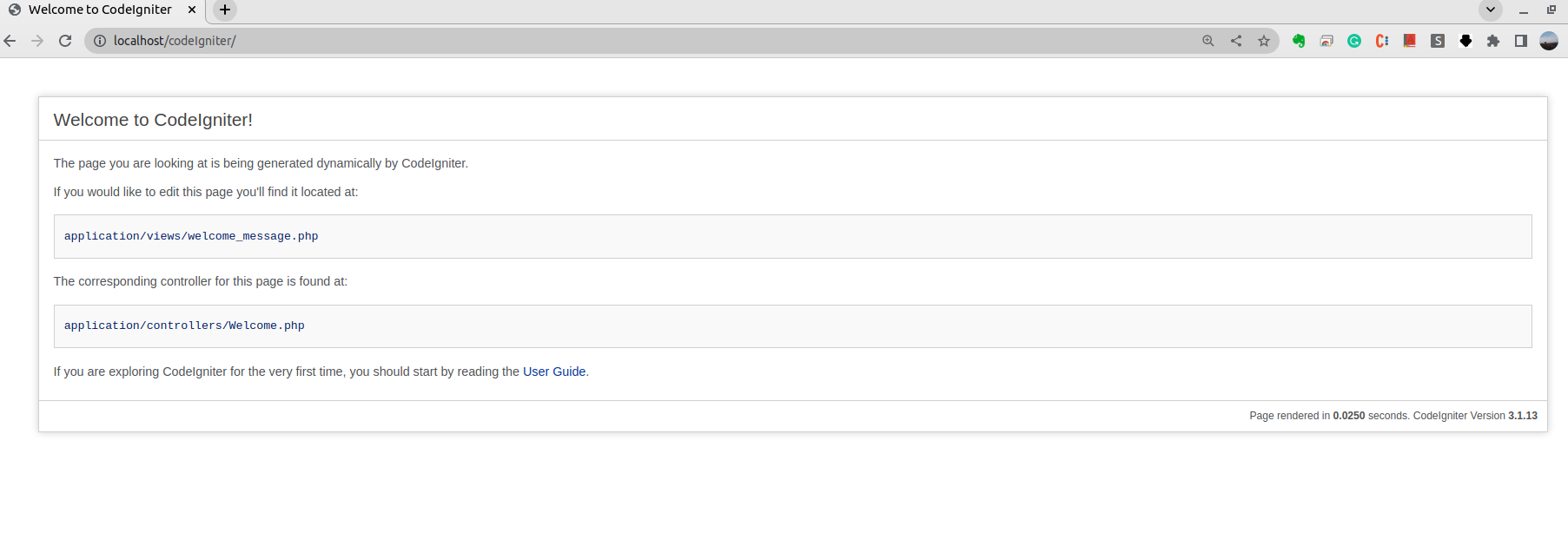 주소창에 localhost/codeIgniter을 입력하면, 아래와 같은 화면이 뜹니다.